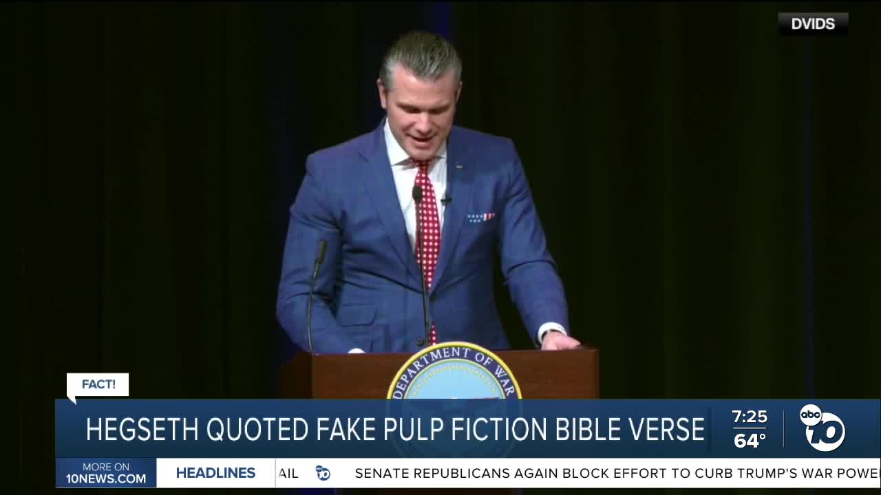 (KGTV) — A story getting some buzz claims Defense Secretary Pete Hegseth quoted a fake Bible verse from the movie Pulp Fiction during a Pentagon sermon.