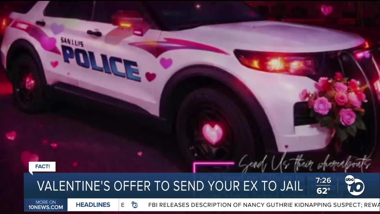 (KGTV) — Stories floating around online claim police departments across the country are offering to send people's exes to jail as a Valentine's gift.