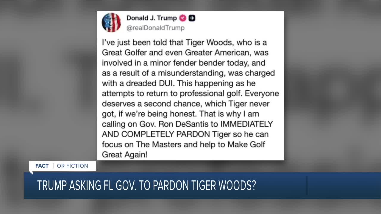 (KGTV) — A story you may be seeing online claims President Trump is asking Florida Governor Ron DeSantis to pardon Tiger Woods, who was arrested for DUI March 27.