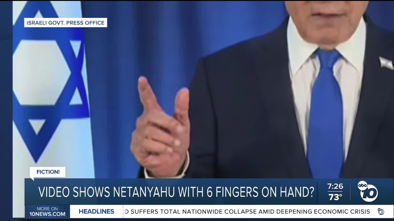 (KGTV) — A rumor spreading all over social media recently claims Israeli Prime Minister Benjamin Netanyahu was killed in an Iranian missile attack and the video of a speech he made March 12 was clearly AI generated because he had 6 fingers on his right hand.