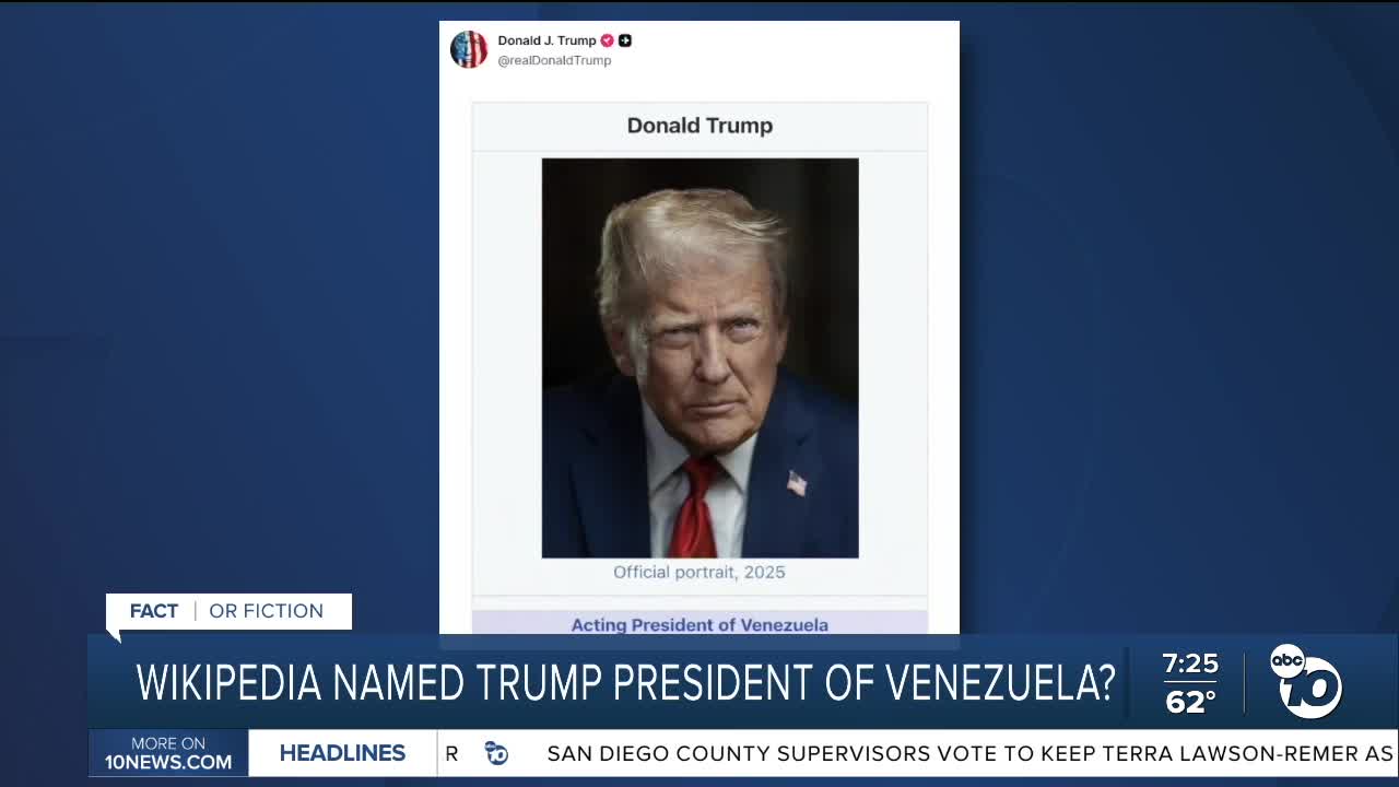 (KGTV) — On January 11, President Trump posted a screenshot on Truth Social appearing to show his Wikipedia page identifying him as acting President of Venezuela.
