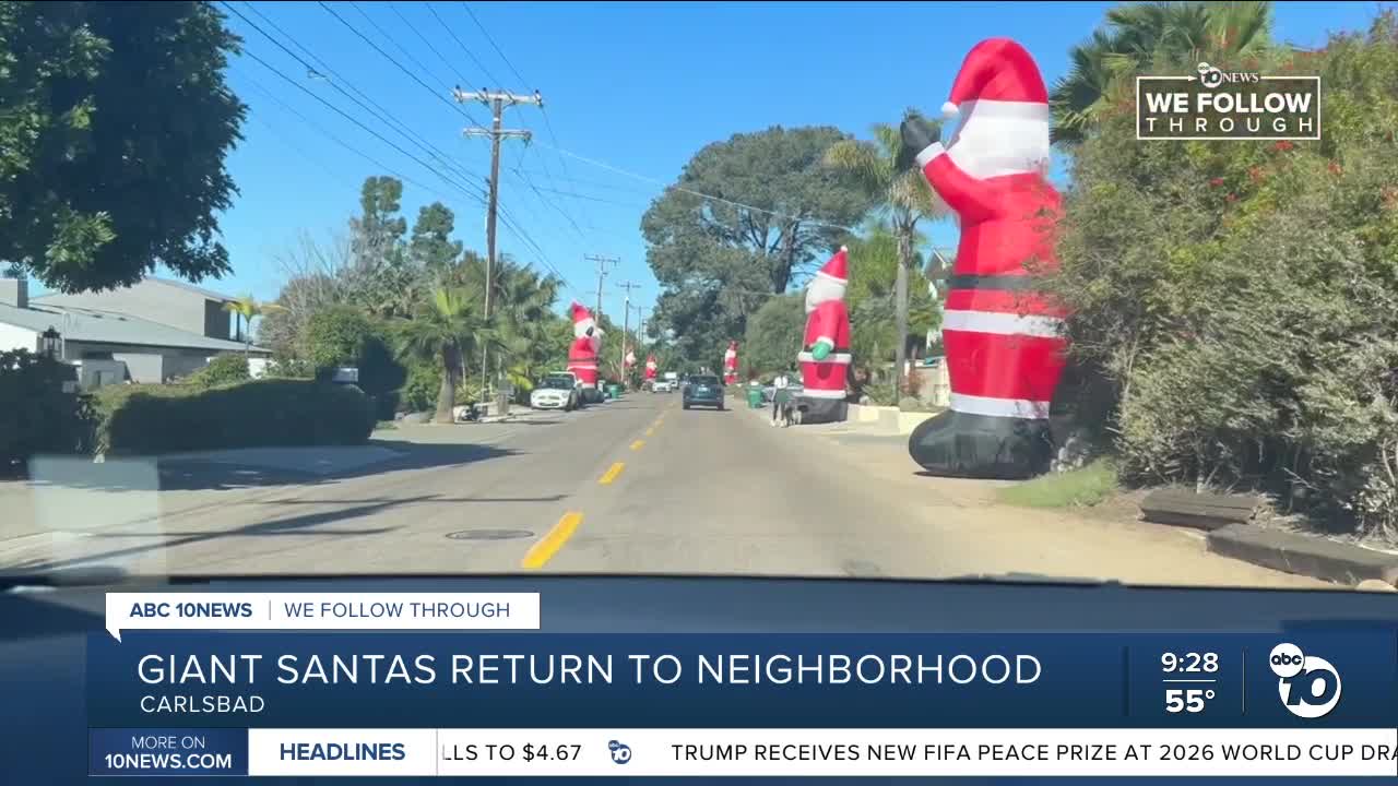 CARLSBAD, Calif. (KGTV) - Dozens of giant inflatable Santas have returned to a Carlsbad neighborhood, a tradition that’s grown stronger in the face of vandalism and thefts.