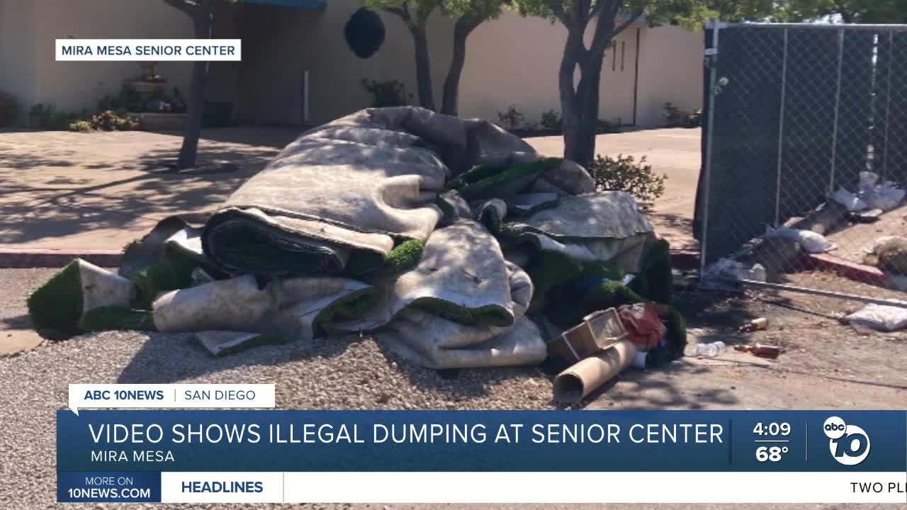 SAN DIEGO (KGTV) - Code enforcement officers are looking for tips, in hopes of identifying a man caught on video illegally dumping a pile of debris in front of the Mira Mesa Senior Center in broad daylight.