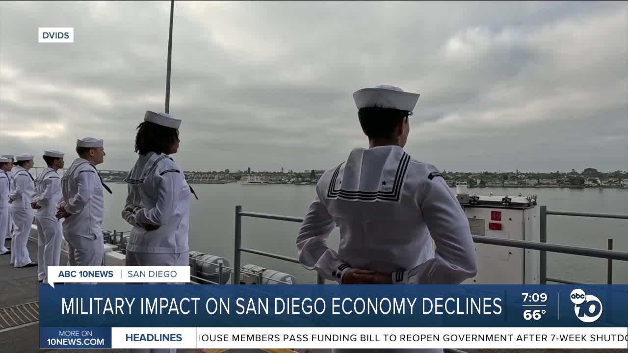 SAN DIEGO (KGTV) — Defense spending and jobs in San Diego declined this past year, reflecting how decisions in Congress can quickly trickle down to local communities.