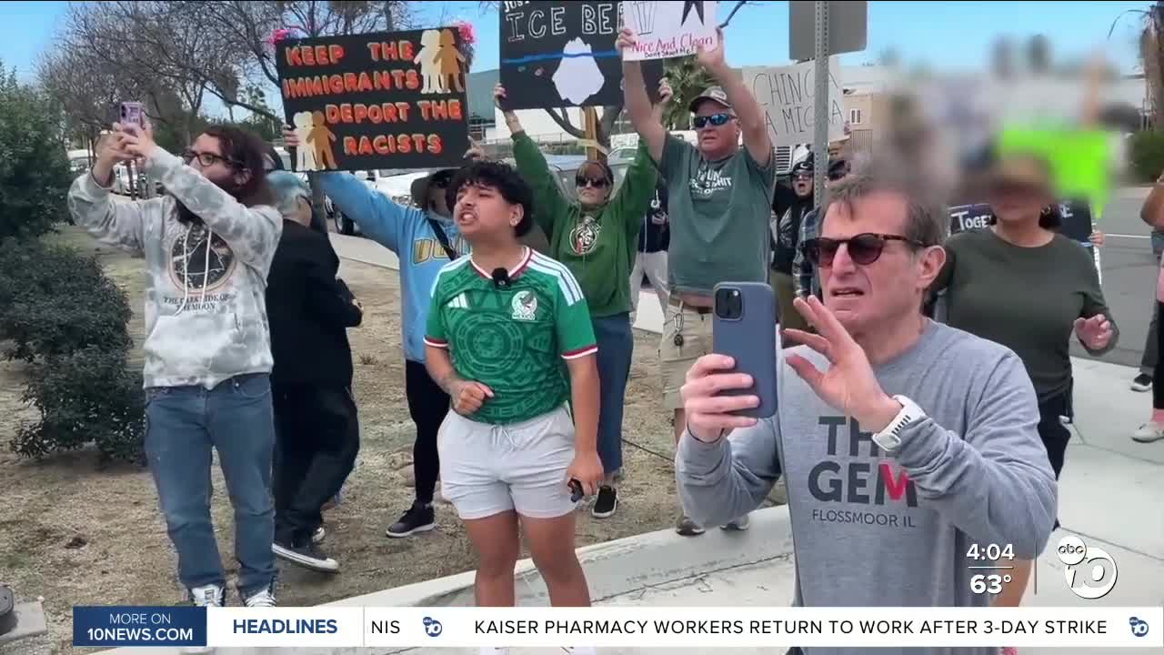 SAN DIEGO (KGTV) — Protesters gathered outside the Otay Mesa Detention Center Wednesday and quickly made their way to where Department of Homeland Security Secretary Kristi Noem held her press conference in San Diego.