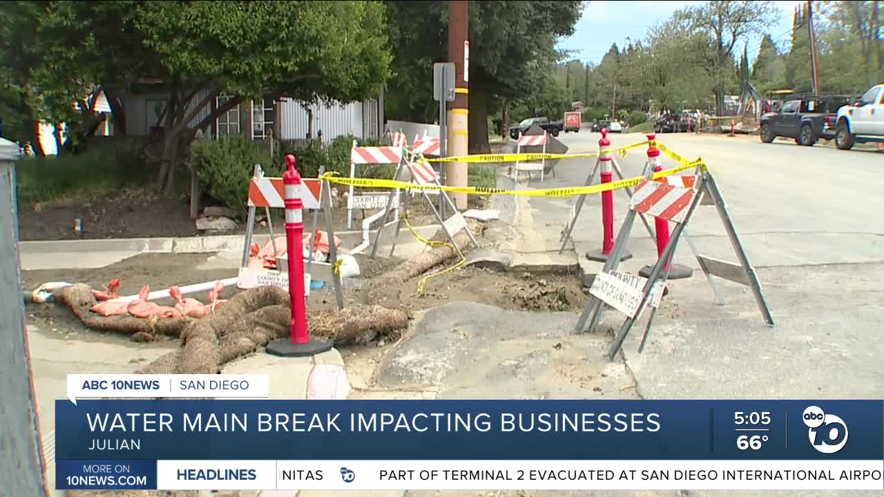 JULIAN, Calif. (KGTV) — A familiar problem has returned to Julian, where another water main break has left parts of the town without water for nearly two days.