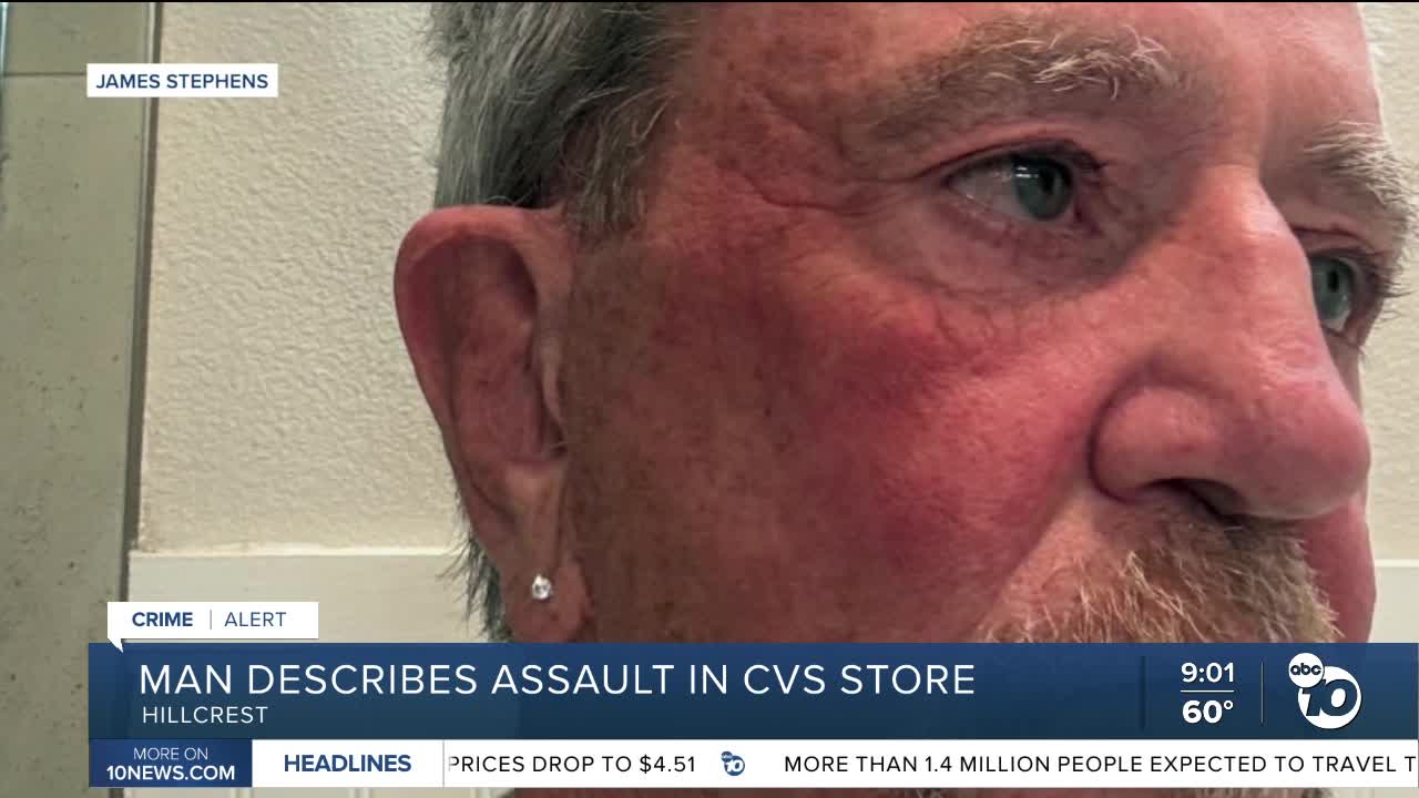 SAN DIEGO (KGTV) - A Hillcrest man is sharing his story after being attacked while filling a prescription at a local CVS, hoping it will lead to tips and an arrest of his assailant, who police believe may have struck again minutes later.