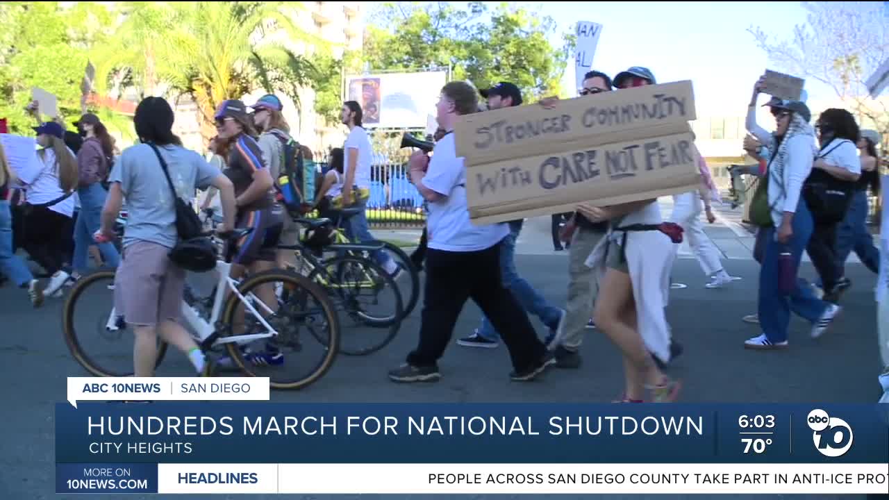 SAN DIEGO (KGTV) — Hundreds gathered at Teralta Park in City Heights on Friday as part of nationwide "ICE Out" protests following the killings of Alex Pretti and Renee Good by federal law enforcement agents in Minneapolis.