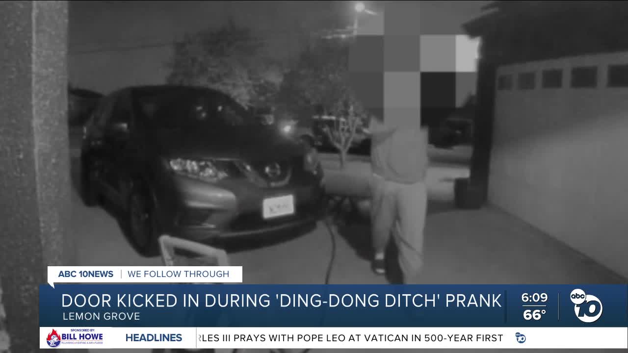 The incident, captured on doorbell camera footage, shows the escalation of ding-dong-ditch pranks that have been spreading across San Diego County since 2023, fueled by TikTok challenges.