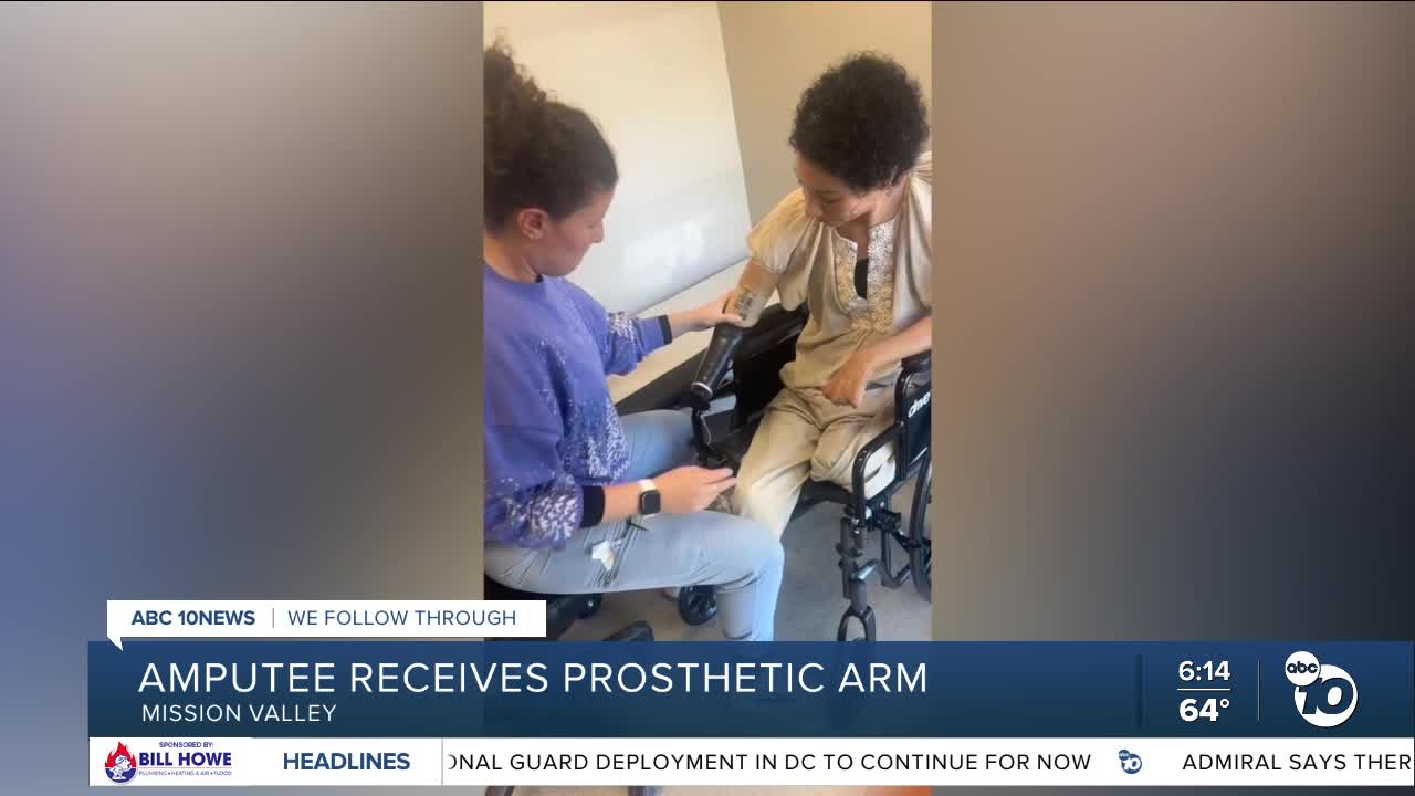 SAN DIEGO (KGTV) - Nearly a year after her harrowing medical journey began, Arisbeth Munoz couldn't stop smiling as she was fitted with her first prosthetic arm at a San Diego clinic.