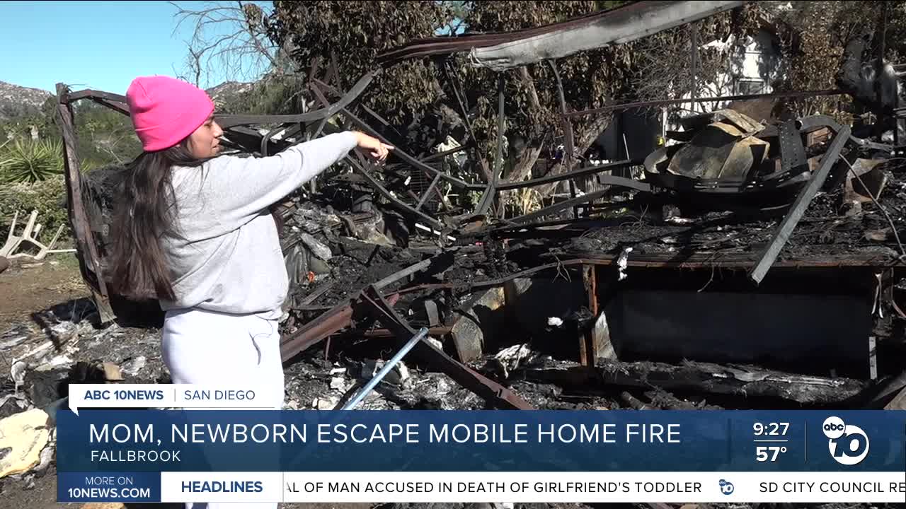 FALLBROOK, Calif. (KGTV) - A Fallbrook mother and her newborn daughter escaped a mobile home fire that destroyed all their belongings, including irreplaceable hospital keepsakes from the baby's birth just days earlier.