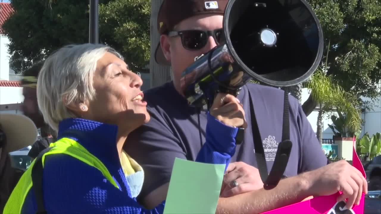OCEANSIDE, (KGTV) — Dozens of protesters gathered at a busy Oceanside intersection Saturday morning, chanting "Hey hey, ho ho, ICE raids have got to go!" as they demonstrated against immigration enforcement while collecting donations for affected families.