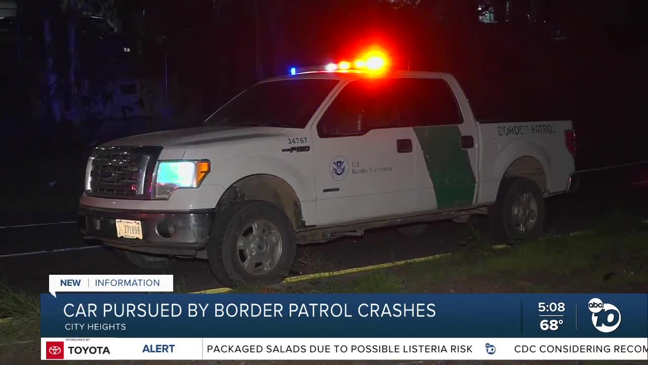 At around 4:13 a.m., Border Patrol agents were chasing a car from Otay Mesa, to northbound I-805 when the vehicle exited on University Avenue and rear-ended an SUV that was not involved in the chase.