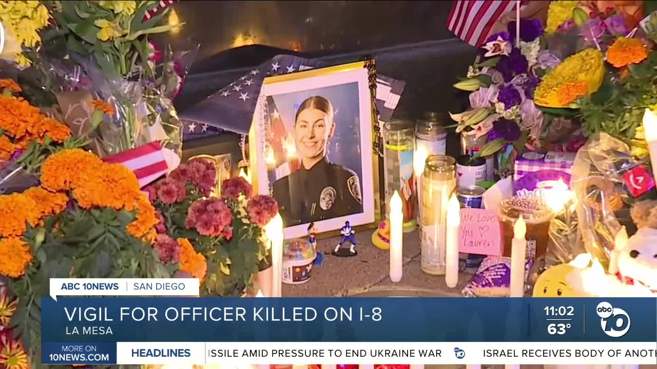 SAN DIEGO (KGTV) — Gathered around a growing memorial for fallen Officer Lauren Craven, the La Mesa Police Department hosted a few hundred people Monday night for an emotional candlelight vigil.