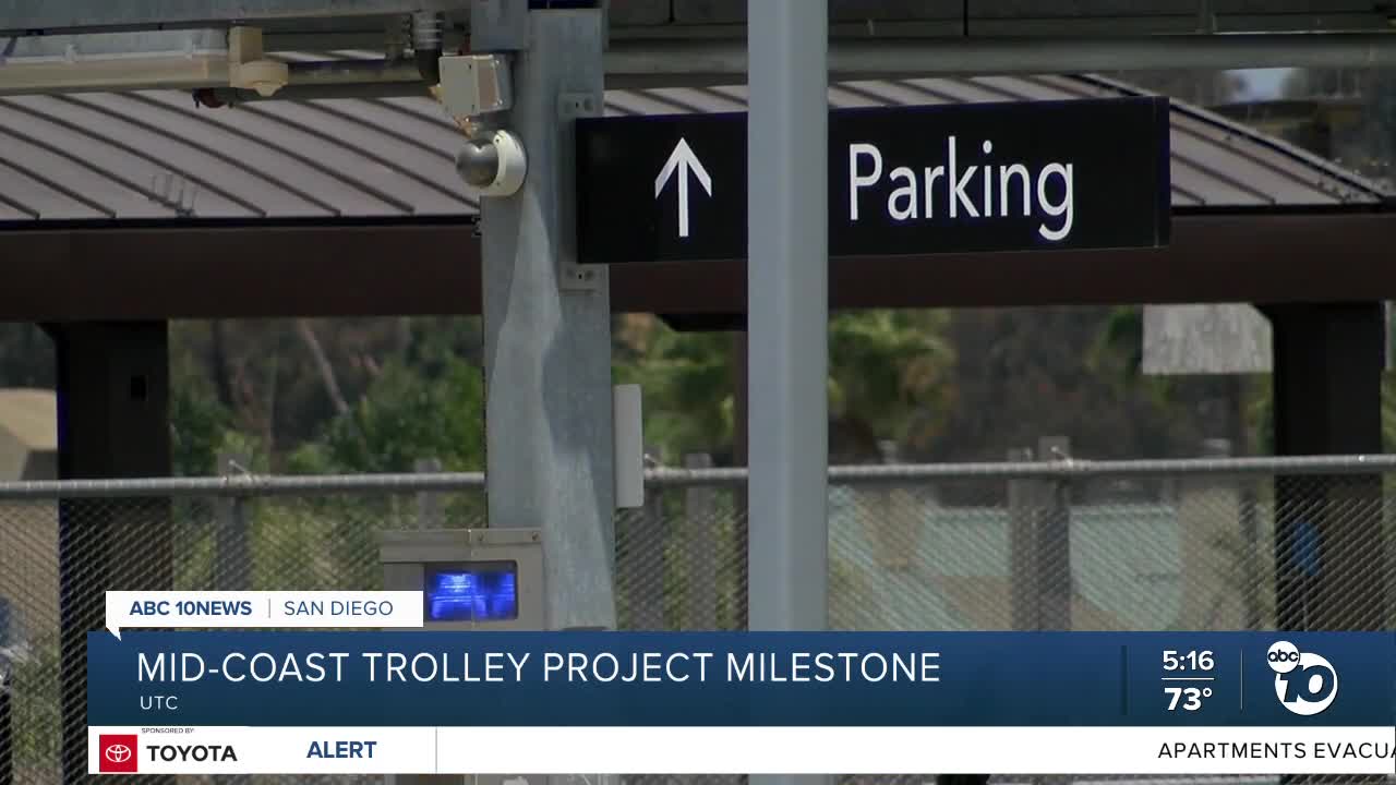 SAN DIEGO (KGTV) — SANDAG's Mid-Coast Trolley project is reaching a major milestone. Workers celebrated a special luncheon Thursday morning, a day before the last batch of concrete is scheduled to be poured into the UTC Transit center's parking lot.