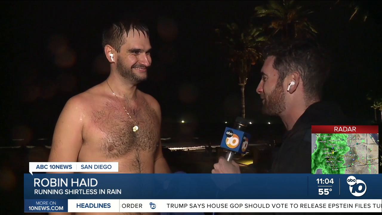 We'll start with a sight we were not expecting — a man running shirtless in the rain.