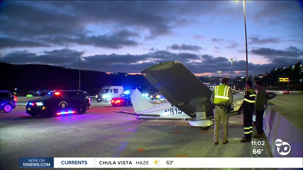 California Highway Patrol Officer Michael Meza said at 5:38 p.m., a small Cessna type plane landed sideways against the center divider wall near Carroll Canyon Road in Sorrento Valley.