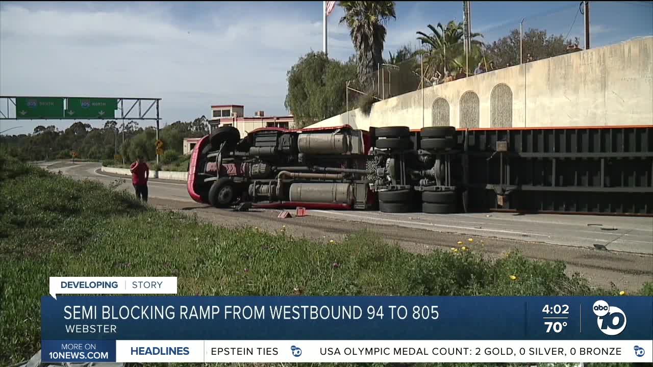 SAN DIEGO (KGTV) — A semi-truck overturned on CA-94 heading west, blocking both the 805 northbound and southbound on-ramps Monday afternoon.