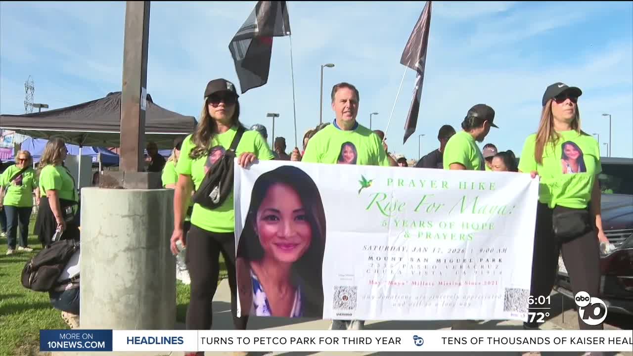 CHULA VISTA, Calif. (KGTV) — Five years after Maya Millete vanished from her Chula Vista home, dozens of community members gathered Saturday for a prayer hike to honor the missing mother of three and ensure her story is not forgotten.