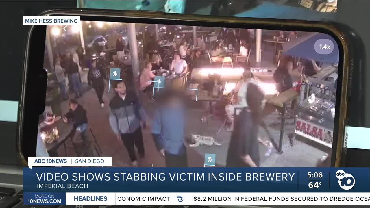 Araceli Banuelos, General Manager of Mike Hess Brewing Imperial Beach, said the brewery was filling up when the victim, wearing a blue shirt, walked in with two other people. Surveillance video showed the man holding his back.
