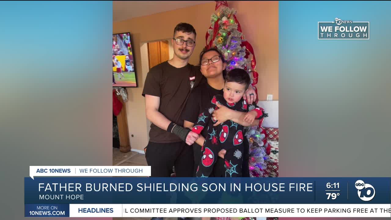 SAN DIEGO (KGTV) - A father is on a ventilator with severe burns after shielding his 2-year-old son during a raging house fire in the Mount Hope area this past weekend.