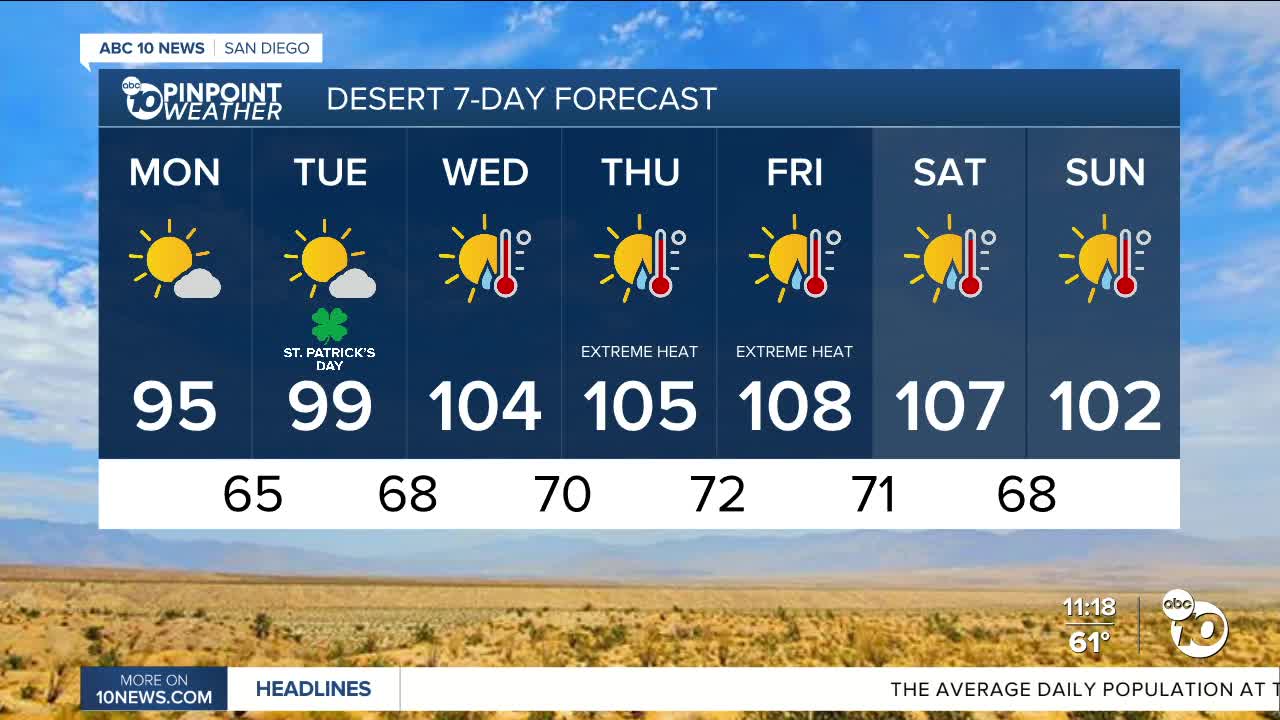 Thursday and Friday is also when an Extreme Heat Watch goes into effect for the mountains and deserts, where temperatures will similarly be up to 30 degrees above normal. That means daytime highs in the mid-80s to 90s for the mountains and a few degrees shy of 110 degrees for the deserts.