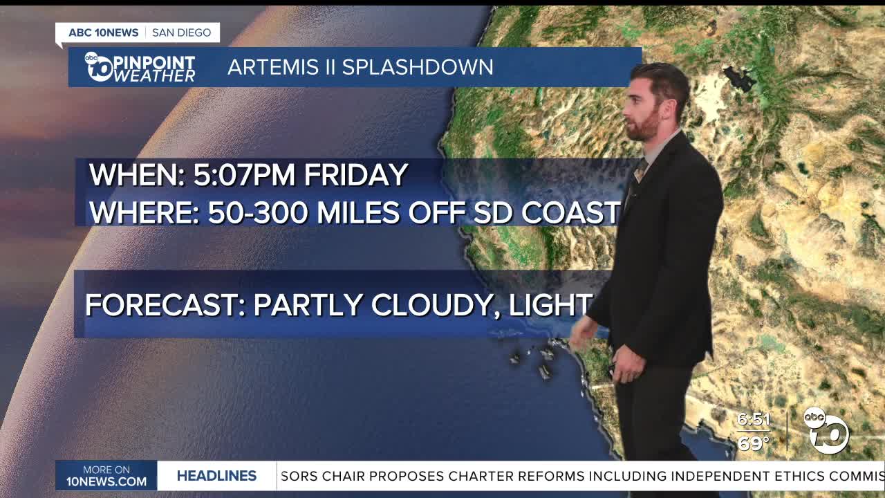The Artemis II splashdown is set for 5:07 p.m. and could land in an area 50-300 miles off the coast of San Diego, but it'll likely be closer to the lower end of that range since weather conditions will be favorable (no rain or thunderstorms within 35 miles, no lightning in the vicinity and wave heights less than 6 feet).