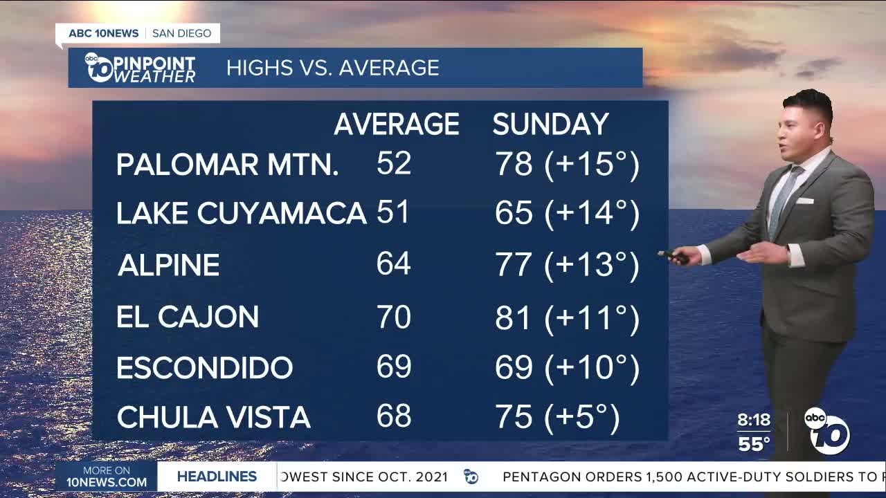 SAN DIEGO (KGTV) — Clear skies and sunny conditions will stick around as we wrap up the weekend and into early this week. Weak Santa Ana winds and high temperatures as much as 10 to 15 degrees above average for the valleys today and Monday.