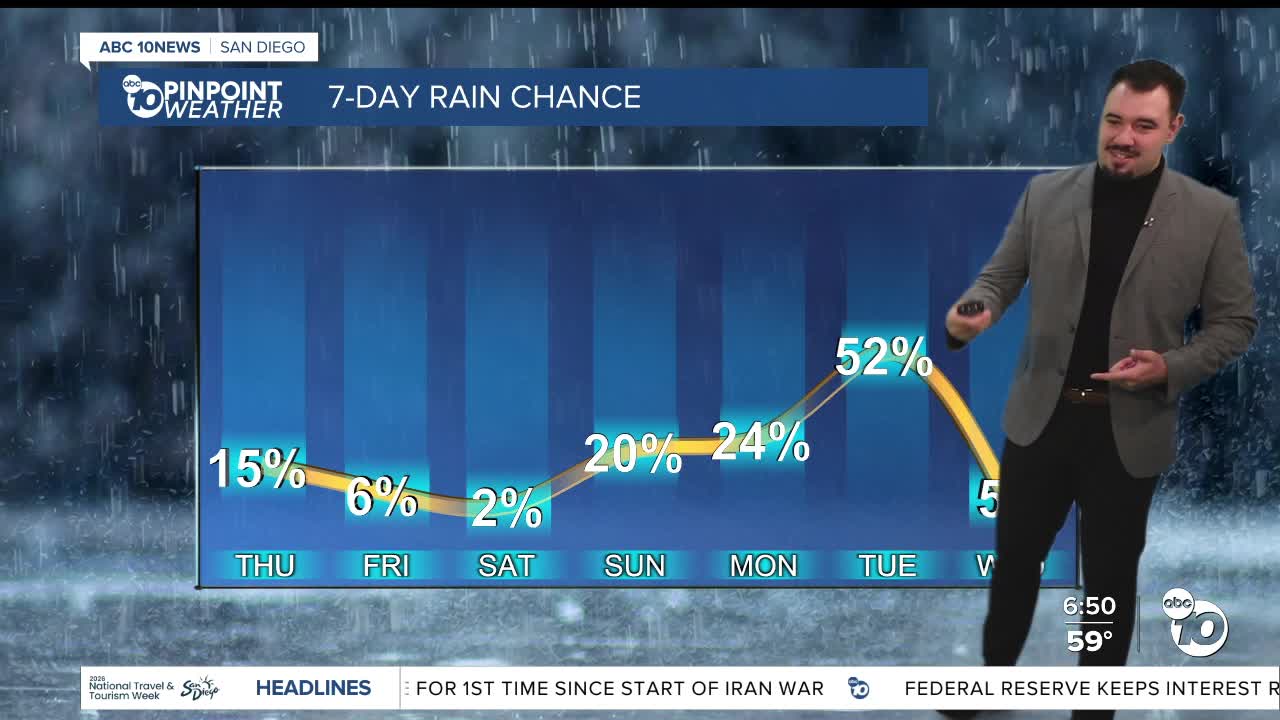 SAN DIEGO (KGTV) — Today is going to be a fairly nice day with above-average temperatures throughout the county, only by about 5 degrees. Some light sprinkles could appear because of a storm system from the Pacific; however, it won't be measurable.