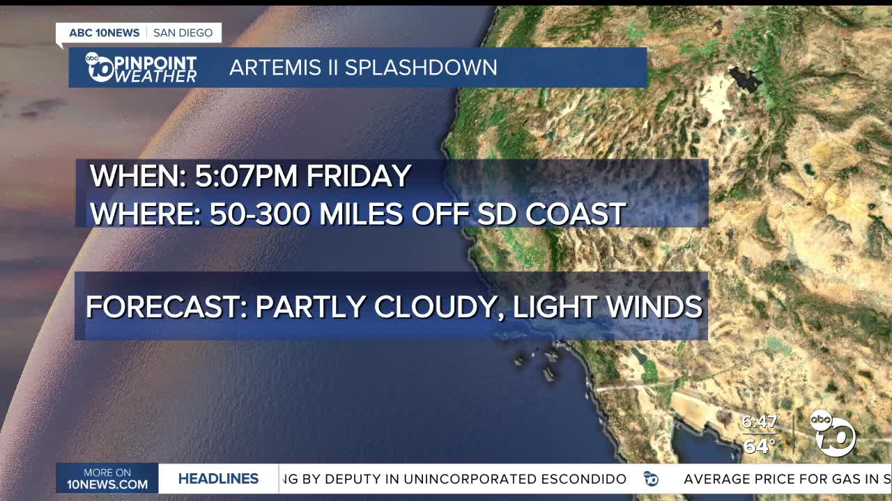 Tomorrow is the big day for the Artemis II splashdown off the coast of San Diego. The landing is planned for 5:07 PM. The good news is that the weather will be nice if you're planning to be on the coast. We may see some clouds, but it should not impact views greatly.