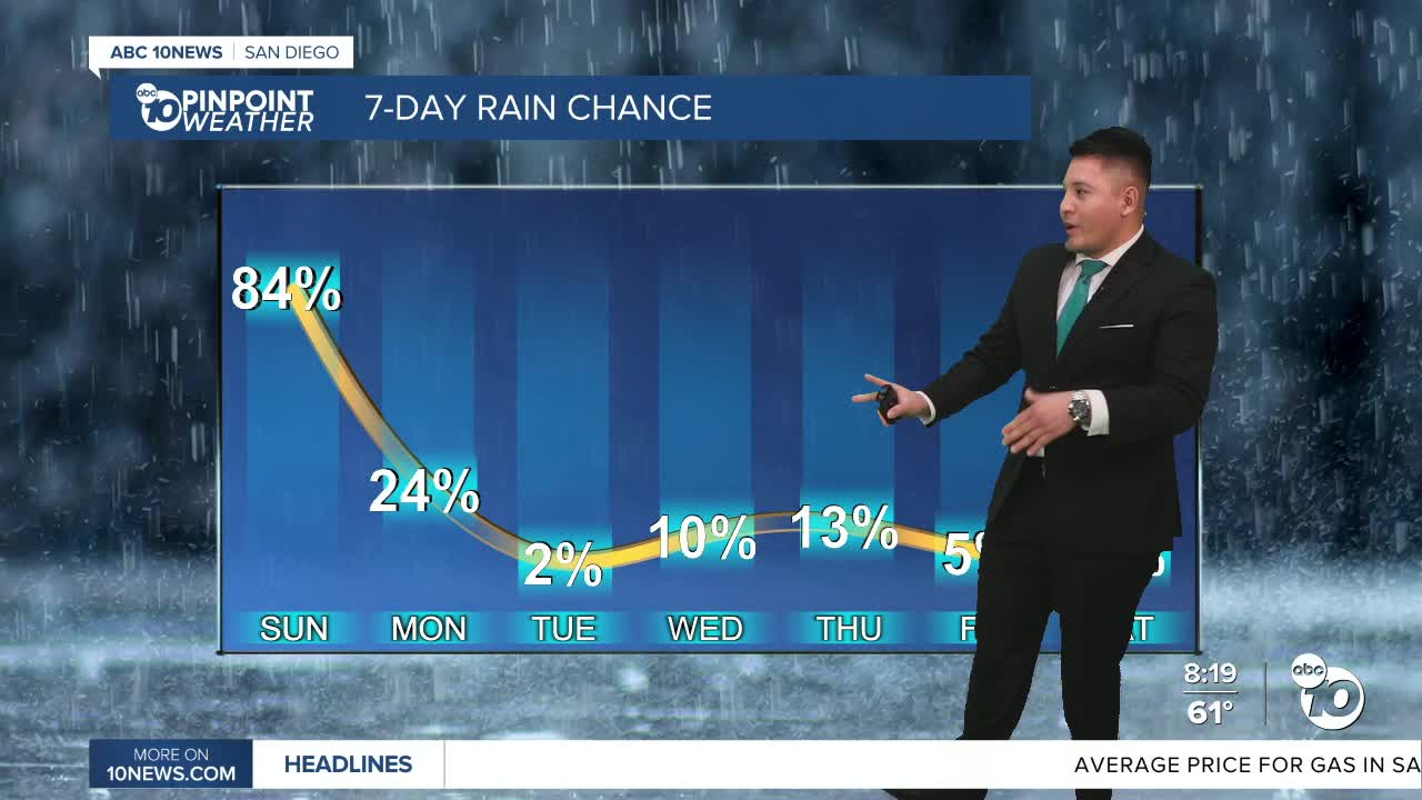 Temperatures will stay well below normal, making for a noticeably cooler day across San Diego County. Showers may become a little more widespread this evening before tapering off overnight into early Monday.