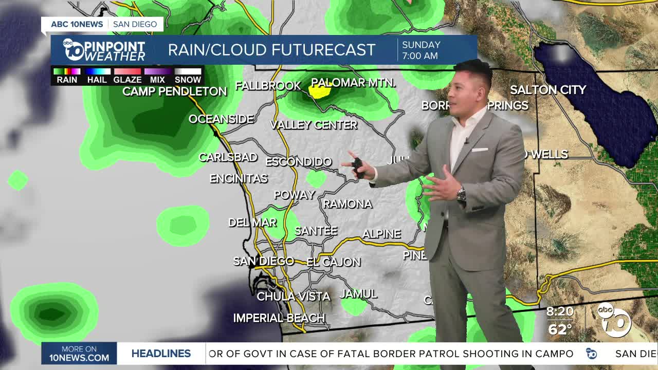 The best chance for rain will be along the coast, foothills and west-facing mountain slopes. Palomar Mountain and nearby areas could see the highest totals, with some spots picking up close to an inch through Monday.