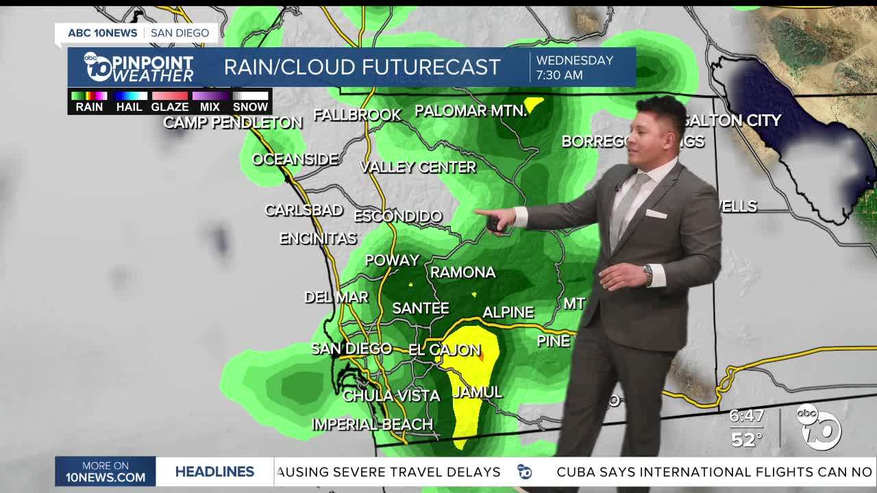 Rain chances also increase late Tuesday night through Wednesday, with the most likely time for widespread rain during the day on Wednesday. Northern areas, including Orange County and parts of southwestern San Bernardino County, could see the highest totals, while amounts decrease farther south into San Diego County.
