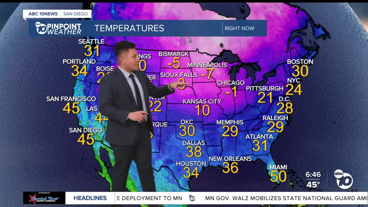 SAN DIEGO (KGTV) — Warm and dry weather will continue through Tuesday, with high temperatures 5 to 15 degrees above normal. Marine layer low clouds and fog could return to the coastal areas as early as tonight into Tuesday morning but confidence is low.