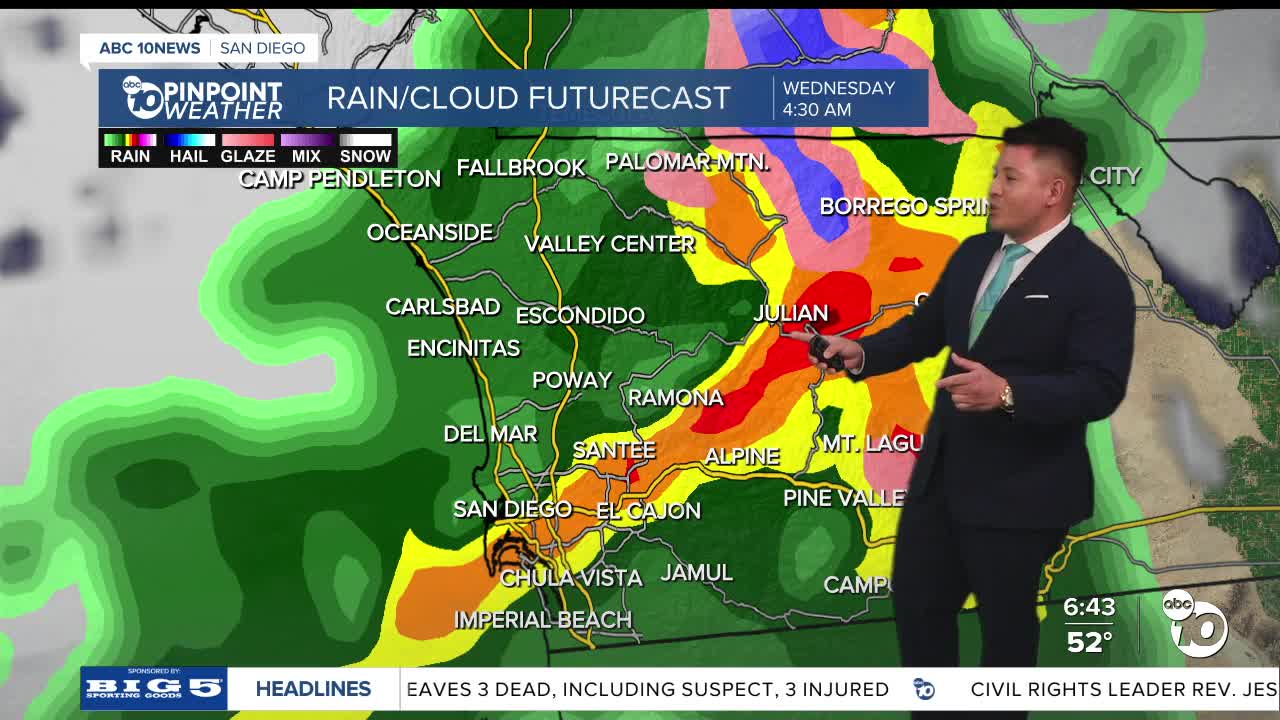 SAN DIEGO (KGTV) — A second wave of widespread rain and mountain snow arrives early Tuesday between 1 and 6 a.m. with occasional showers during the day. Another round of widespread rain and snow moves in early Wednesday between 2 a.m. and 7 a.m., scattered showers during the day while Thursday will bring more rain during the day and showers tapering off Friday.