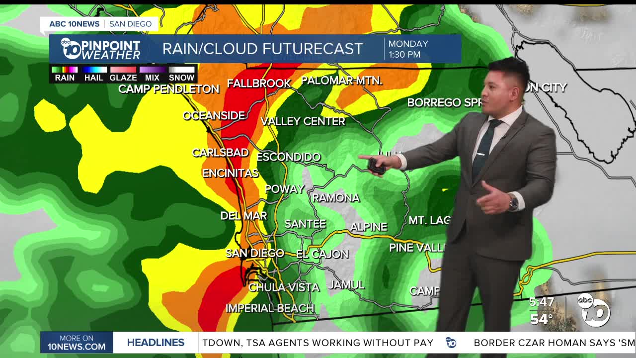 SAN DIEGO (KGTV) — A winter storm will move into the area today into early Tuesday bringing widespread moderate to heavy rain, mountain snow, and gusty onshore winds. There is a 15 to 20% chance of thunderstorms tonight. Showers will continue on Tuesday with strengthening west winds along the mountain crests and desert slopes, which peak Tuesday evening into Wednesday morning with gusts in excess of 60 mph.