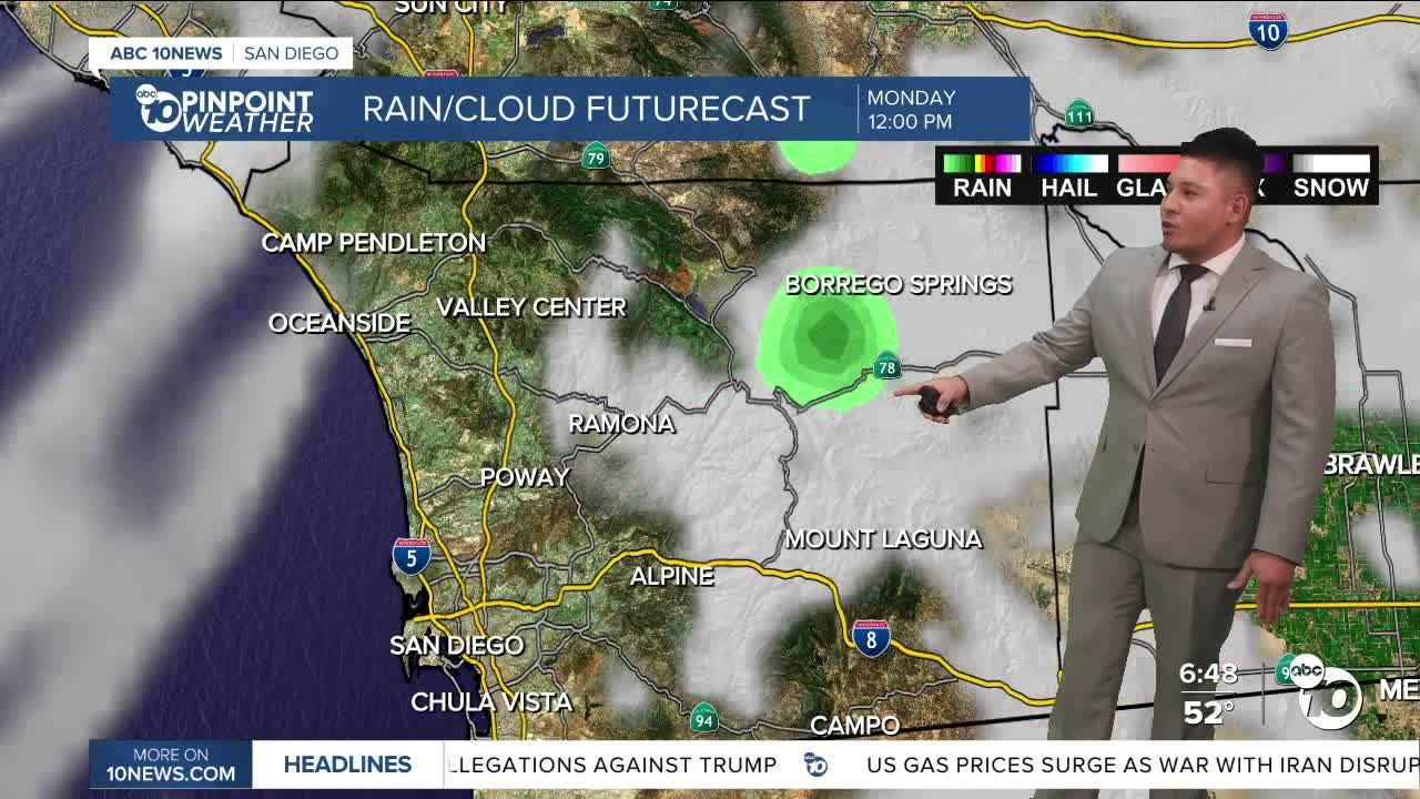 Despite the warmer weather, the same low-pressure system will also bring a small chance of light showers later today through Monday afternoon, mainly in the mountains of San Diego County. Rainfall totals are expected to remain minimal, with less than one-tenth of an inch possible.