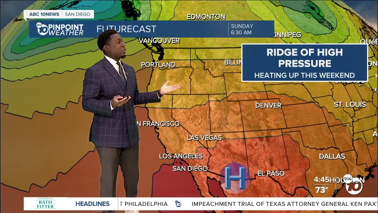A ridge of high pressure will bring us warmer temperatures beginning Thursday, peaking on Sunday. Saturday will bring highs in the upper 70s and lower 80s for the coastline, while inland neighborhoods can expect temperatures in the low to mid-90s. Desert communities will see temperatures near 110 degrees.