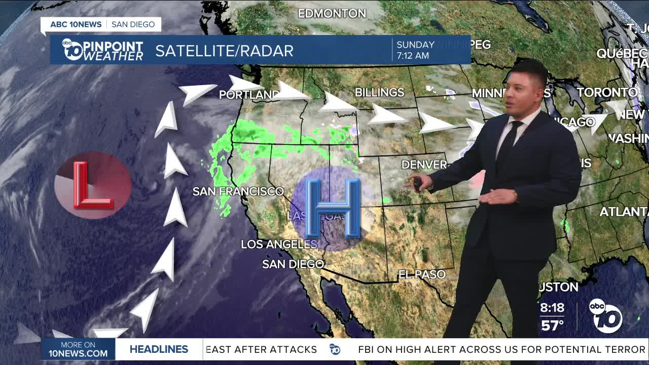 A calm morning is expected across the region, with low clouds forming near Point Loma, North Island, and off the Carlsbad coast. Patchy fog is possible along the coastal slopes and in some inland valleys, and in a few spots it could become dense. The marine layer will thicken tonight into Monday morning, and there is a slight chance of light drizzle near coastal foothills.