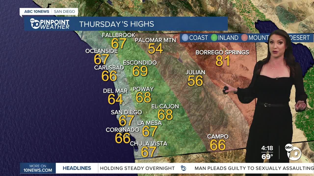 Thursday will be the coolest day of the week with mostly 60s for the coast and valleys, 50s in the mountains and 80s in the deserts.