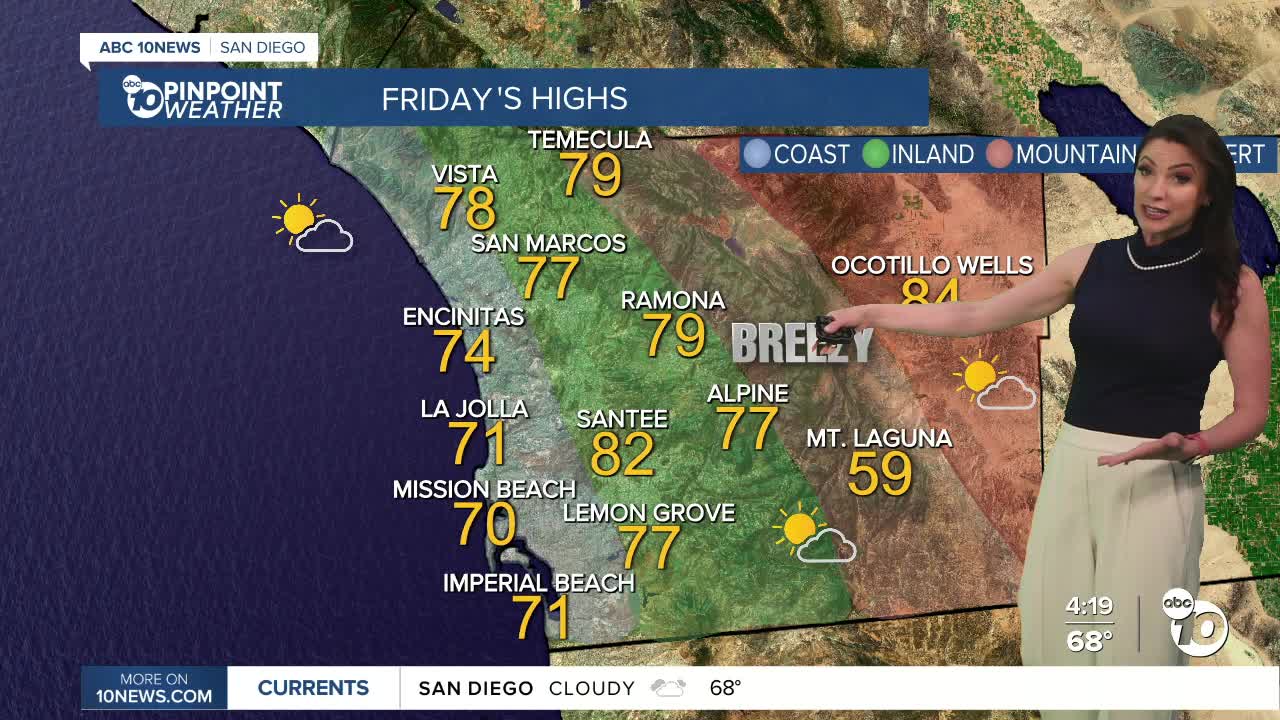 Gusty onshore winds persisted today, though not as strong as Wednesday. Peak gusts exceeded 20mph for some coastal and valley areas while the mountains clocked peak gusts of 51mph at Cuyamaca Peak. A Wind Advisory remains for the mountains and deserts ends11pm Thursday.