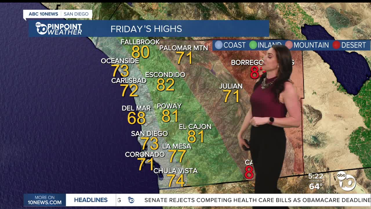 The mountains and deserts will be just as warm on Friday, while it will be several degrees cooler along the coast and in the valleys as the sea-breeze strengthens and patchy low clouds and fog return. Despite the drop in temperatures, highs will remain 7 to 21 degrees above average. I'm forecasting record highs in Campo (81) and Borrego Springs (83).
