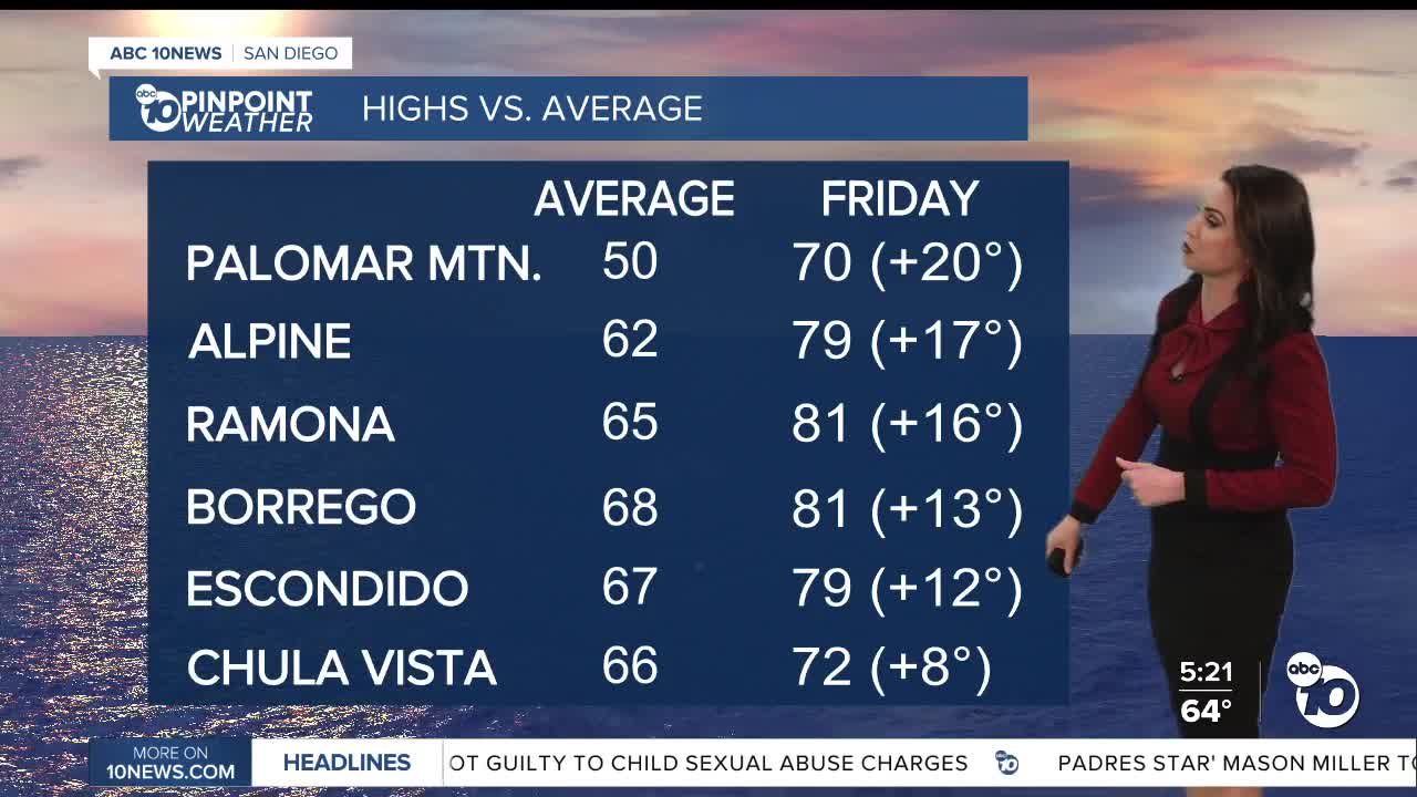 Friday will be about 5 degrees cooler for the coast and inland areas, but still 10 to 20 degrees above average for most of the county.