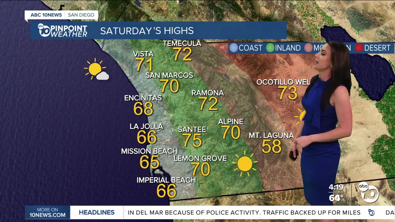 Clear skies will be the trend through Saturday with chilly mornings and warm afternoons. Highs saturday will be near average for the coast and deserts while inland and mountain communities will be 5 to 10 degrees above average.
