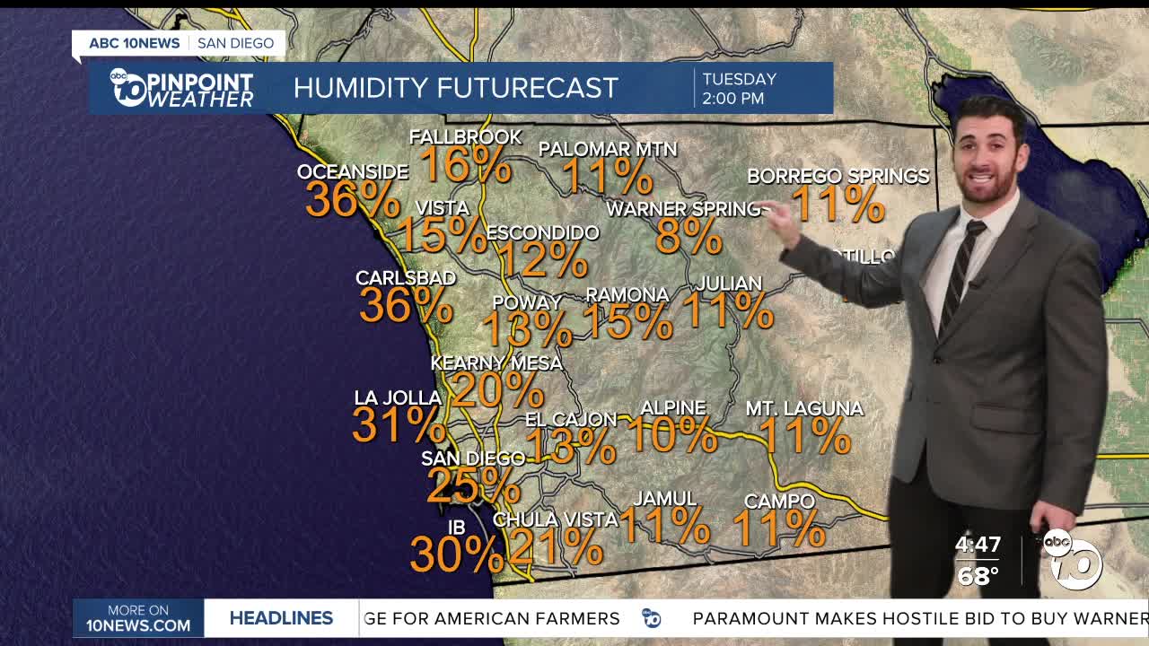 In that window, minimum relative humidity will continue to drop, with most areas on Tuesday falling between 10-15%, and some select spots like Warner Springs dropping into the single digits.