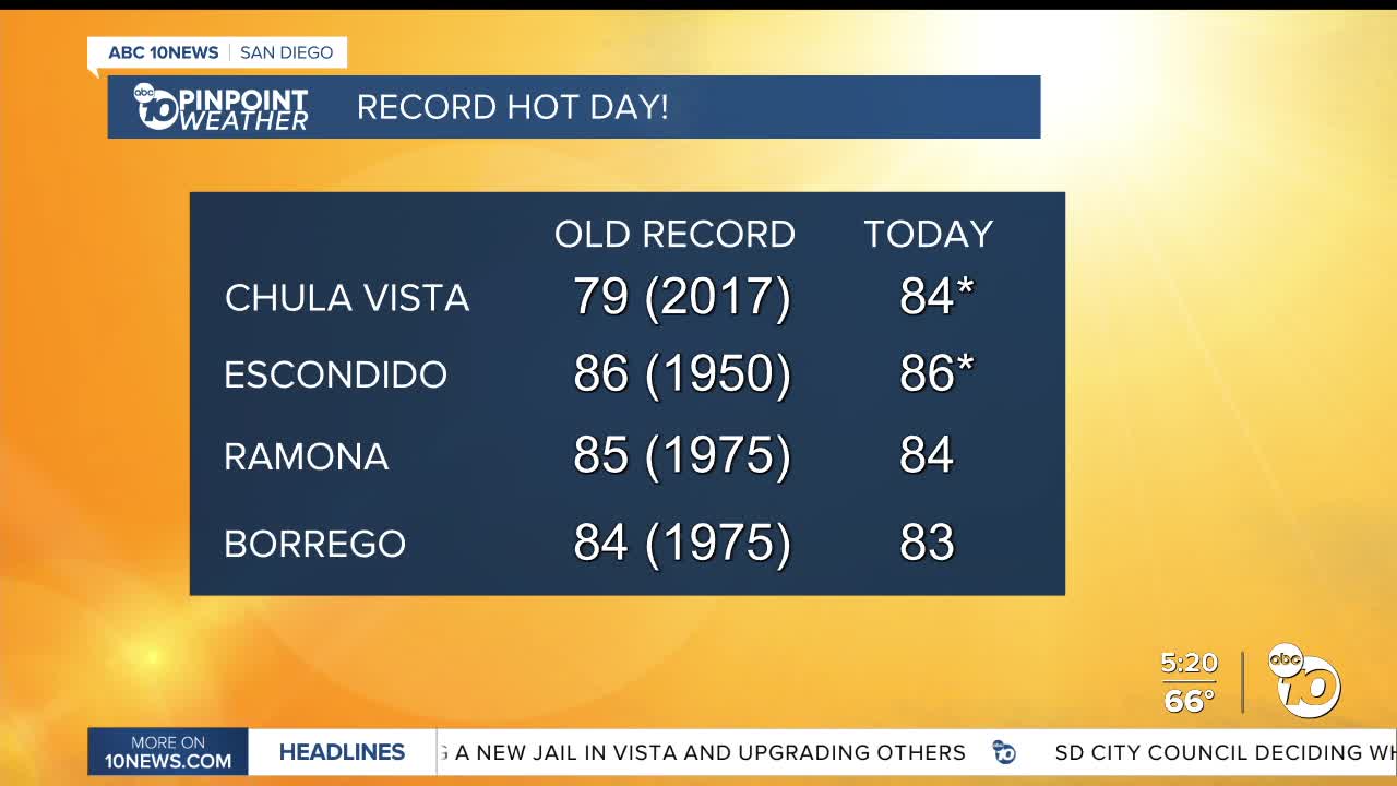 I'm forecasting record highs on Wednesday in Ramona (86°), Escondido (87°), and Chula Vista (79°), while we may be a degree or two shy in El Cajon, Palomar Mountain, and Alpine.