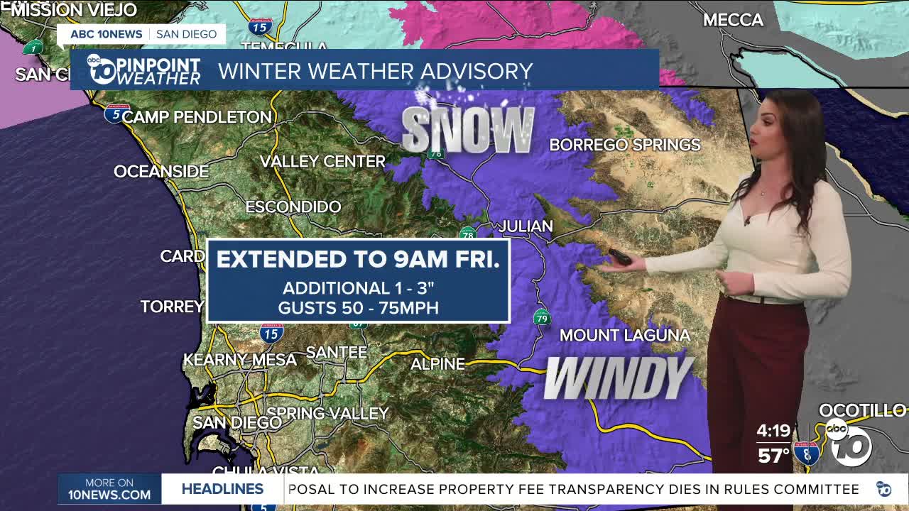 The Winter Weather Advisory for the mountains has been extended until 9am Friday. Additional snow of 1 to 3" is possible, mainly above 4,500 feet, but we may see a dusting in Julian, which is at 4,240 feet. Snow levels will hover between 4,000 and 5,000 feet through Friday morning, potentially even as low as 3,500 feet.