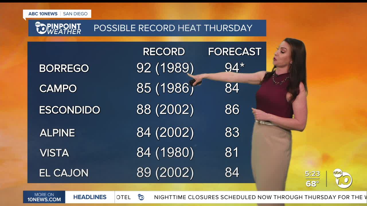 Thursday will be slightly warmer with highs soaring 10 to 20 degrees above average. I'm forecasting a record high in Borrego Springs again, while several cities will be close to records, including Campo, Escondido, Alpine, and Vista. The heat peas Friday, locally up to 25 degrees above normal with several more record highs within reach.
