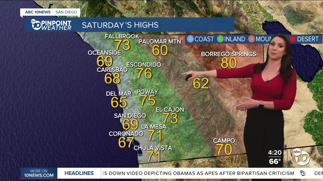 Saturday temperatures will be near to 10 degrees above average, becoming warmer on Sunday, with highs soaring 10 to 15 degrees above average! On Sunday, you can expect highs in the 70s along the coast, upper 70s to low-80s inland, 60s in the mountains, and 80s in the deserts.