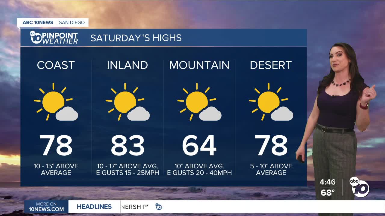 High pressure over the west, coupled with weak to mild Santa Ana winds, will keep temperatures 5 to 17degrees above average through Monday. That takes us into the 70s and 80s for most of the county and 60s for most mountains.